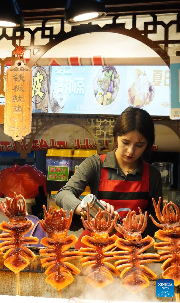 A local cook introduces his food to tourists in the ancient city of Kashgar, northwest China's Xinjiang Uygur Autonomous Region, Sept. 19, 2024. (Xinhua/Zhao Yusi)