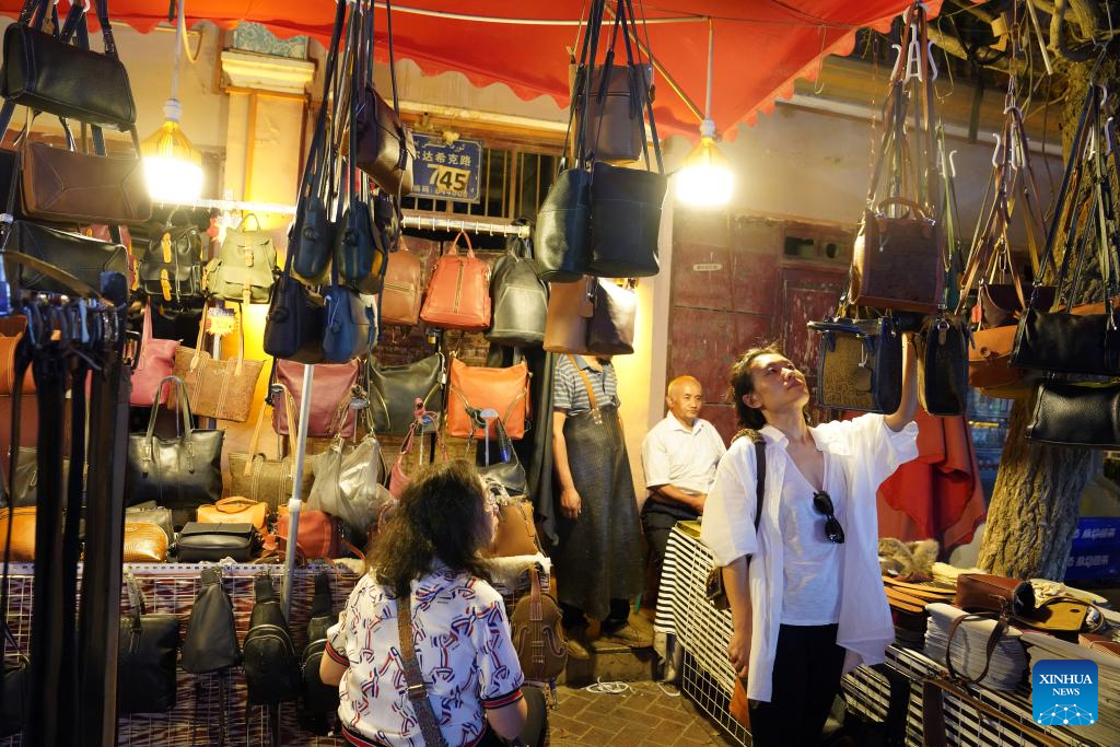 Tourists select leather bags in the ancient city of Kashgar, northwest China's Xinjiang Uygur Autonomous Region, Sept. 19, 2024. (Xinhua/Zhao Yusi)