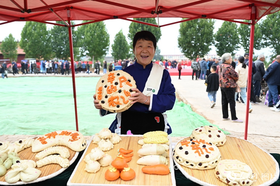A villager displays a steamed bun during a celebration for the seventh Chinese farmers' harvest festival in Beizhai village, Shaoyuan township, Jiyuan city, central China's Henan Province, Sept. 22, 2024. (People's Daily Online/Wang Yuxing)