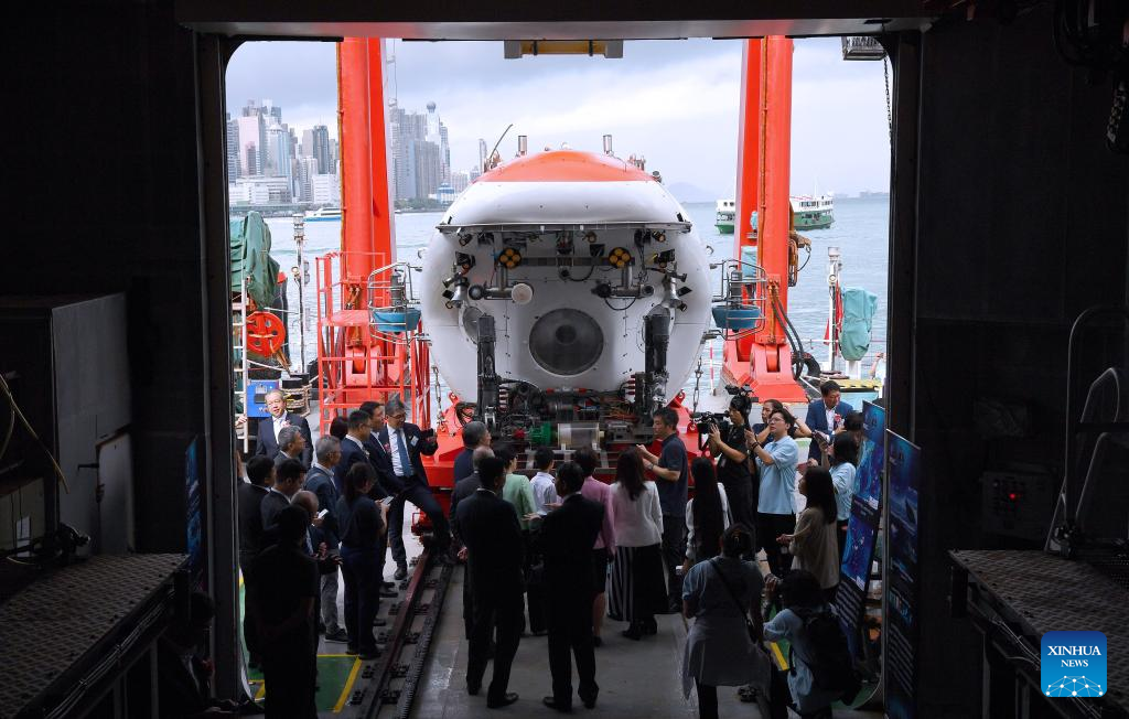 This photo shows manned submersible Jiaolong on research vessel Deep Sea No. 1 at Tsim Sha Tsui Ocean Terminal in Hong Kong, south China, Sept. 24, 2024. (Xinhua/Chen Duo)