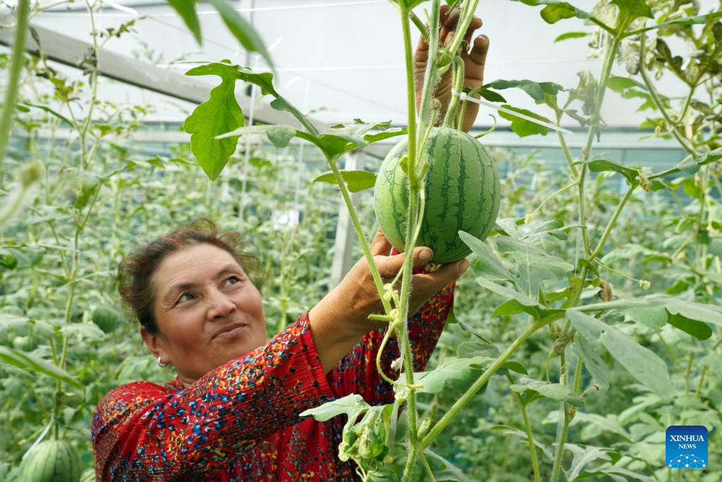 A worker works at a watermelon cultivation base, one of the "pairing assistance" programs of east China's Shandong province, in Shule County of Kashgar, northwest China's Xinjiang Uygur Autonomous Region, Sept. 21, 2024. (Xinhua/Zhao Yusi)