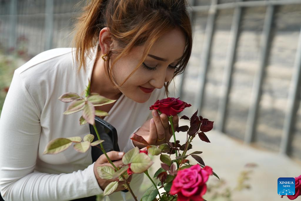 A worker smells roses planted at an agricultural industrial park, one of the "pairing assistance" programs of east China's Shandong province, in Yengisar County of Kashgar, northwest China's Xinjiang Uygur Autonomous Region, Sept. 22, 2024. (Xinhua/Zhao Yusi)
