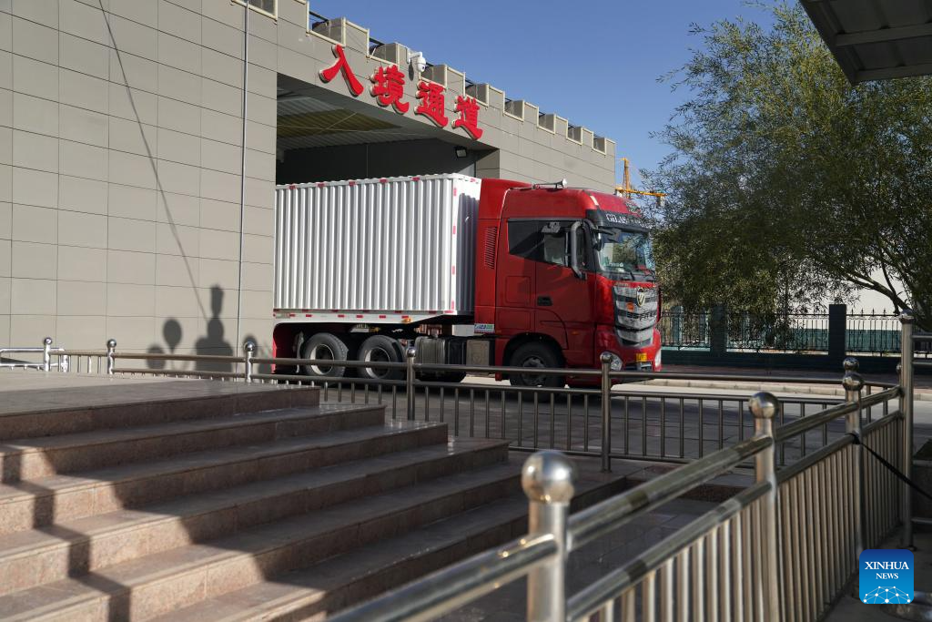 A truck passes through the Khunjerab Pass in Kashgar, northwest China's Xinjiang Uygur Autonomous Region, Sept. 20, 2024. Khunjerab Pass is a land port on the China-Pakistan border and an important gateway to South Asia and Europe. The pass used to offer seasonal access service that started on April 1 and ended on Nov. 30, but it has shifted to full-year service as of Sept. 20 this year. (Xinhua/Zhao Yusi)