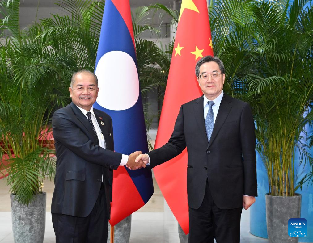Chinese Vice Premier Ding Xuexiang, also a member of the Standing Committee of the Political Bureau of the Communist Party of China (CPC) Central Committee, meets with Deputy Prime Minister of Laos Kikeo Khaykhamphithoune, who is in China to attend the 21st China-ASEAN Expo and the China-ASEAN Business and Investment Summit, in Nanning, south China's Guangxi Zhuang Autonomous Region, Sept. 24, 2024. (Xinhua/Yan Yan)