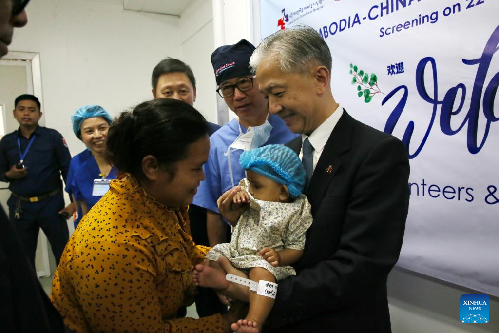 Chinese Ambassador to Cambodia Wang Wenbin (1st R) holds a child with facial deformity in Phnom Penh, Cambodia on Sept. 25, 2024. Chinese charitable organization Future Smile Charitable Foundation on Wednesday donated four ambulances to Cambodia and provided free surgical operations to Cambodian children with cleft lip, cleft palate and other facial deformities. (Photo by Phearum/Xinhua)