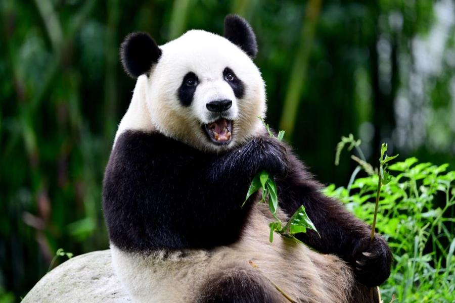 Giant panda Ke Ke eats bamboo at the Dujiangyan base of the China Conservation and Research Center for Giant Panda in Dujiangyan, southwest China's Sichuan Province, Sept. 25, 2024. (Photo: China News Service/Li Chuanyou)