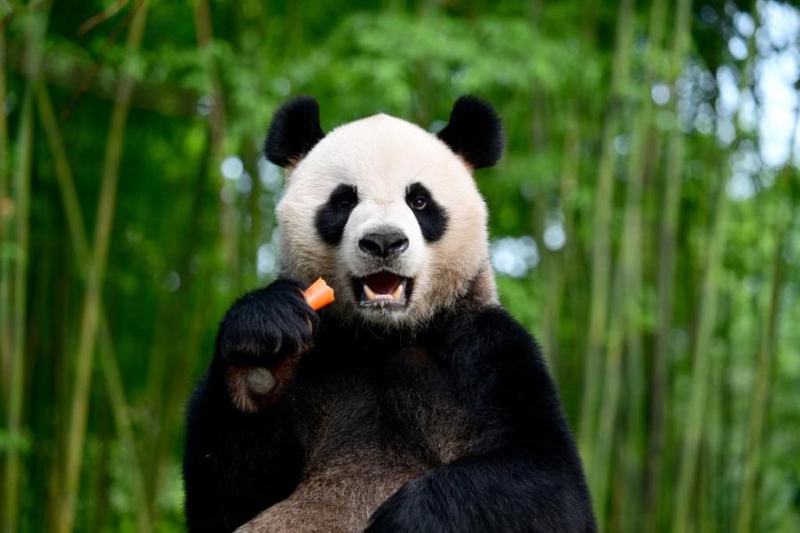 Giant panda An An eats a carrot at the Dujiangyan base of the China Conservation and Research Center for Giant Panda in Dujiangyan, southwest China's Sichuan Province, Sept. 25, 2024. (Photo: China News Service/Li Chuanyou)