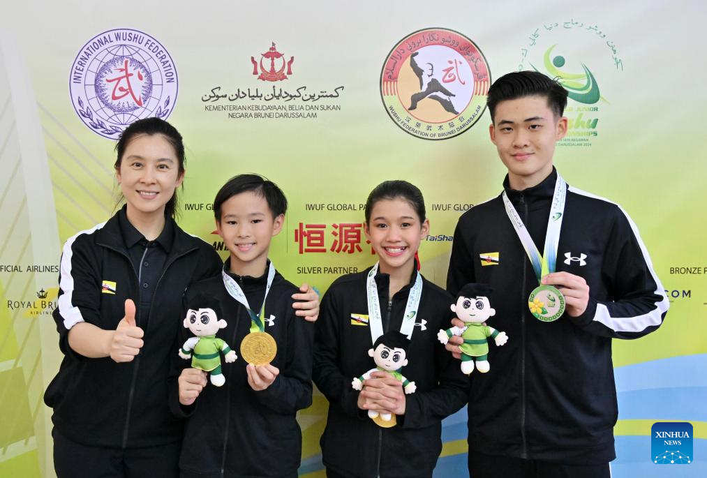 Medalists Chu Ching Hwa (1st R), Meagan Marie Keasberry (2nd R), Samuel Yong Jun Ong (2nd L) of Brunei pose for photos with their coach Zhao Chunjie from China at the World Junior Wushu Championships in Bandar Seri Begawan, Brunei, Sept. 26, 2024. (Photo by Huang Zhiping/Xinhua)