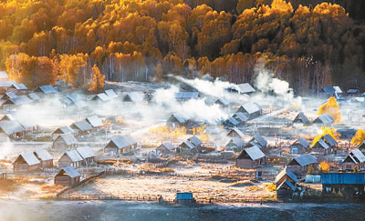 File photo shows the morning mist lingering in Hemu village, Burqin county, Altay, northwest China's Xinjiang Uygur Autonomous Region.