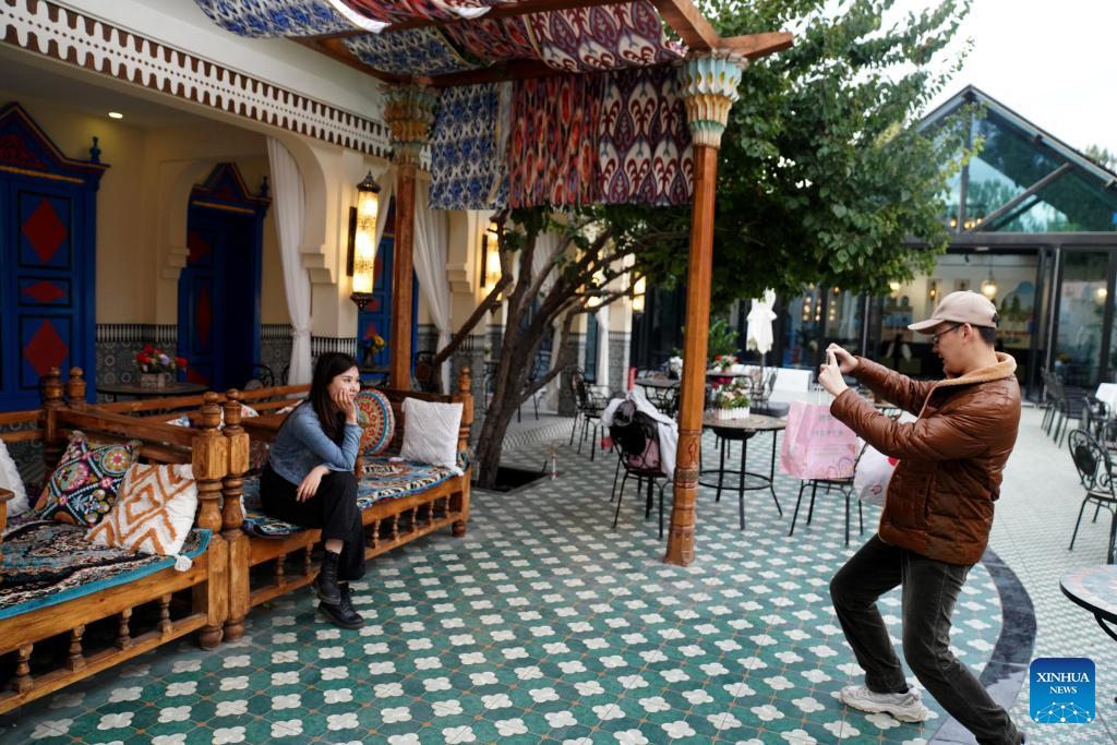 A tourist is seen at a restaurant on the Liuxing Street in Yining City, Ili Kazak Autonomous Prefecture, northwest China's Xinjiang Uygur Autonomous Region, Sept. 27, 2024. (Xinhua/Zhao Yusi)