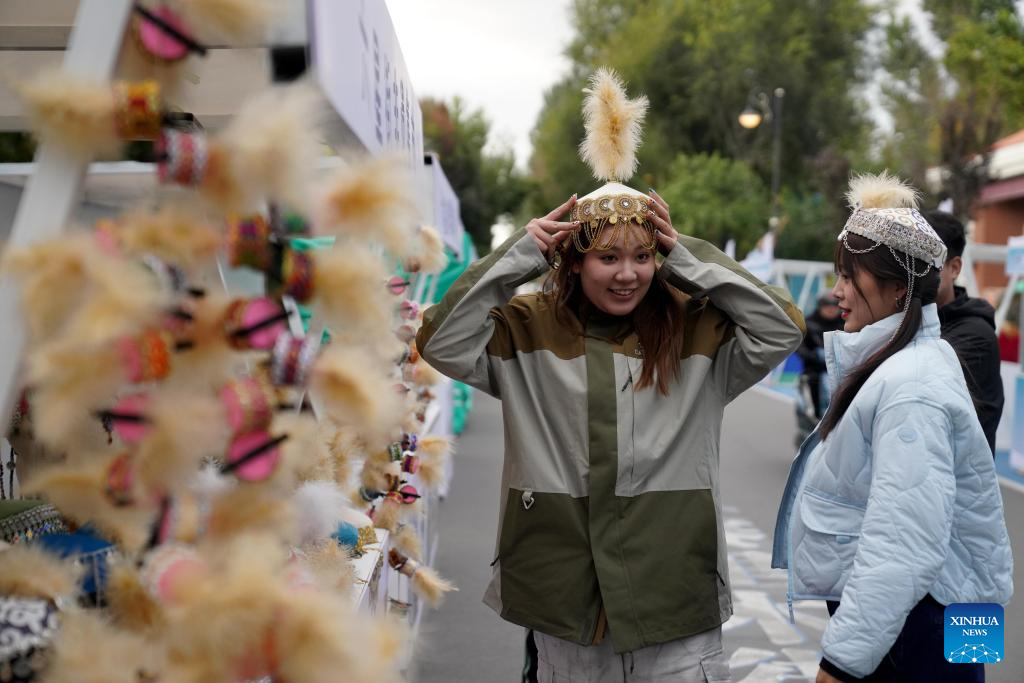 Tourists select hats on the Liuxing Street in Yining City, Ili Kazak Autonomous Prefecture, northwest China's Xinjiang Uygur Autonomous Region, Sept. 27, 2024. (Xinhua/Zhao Yusi)