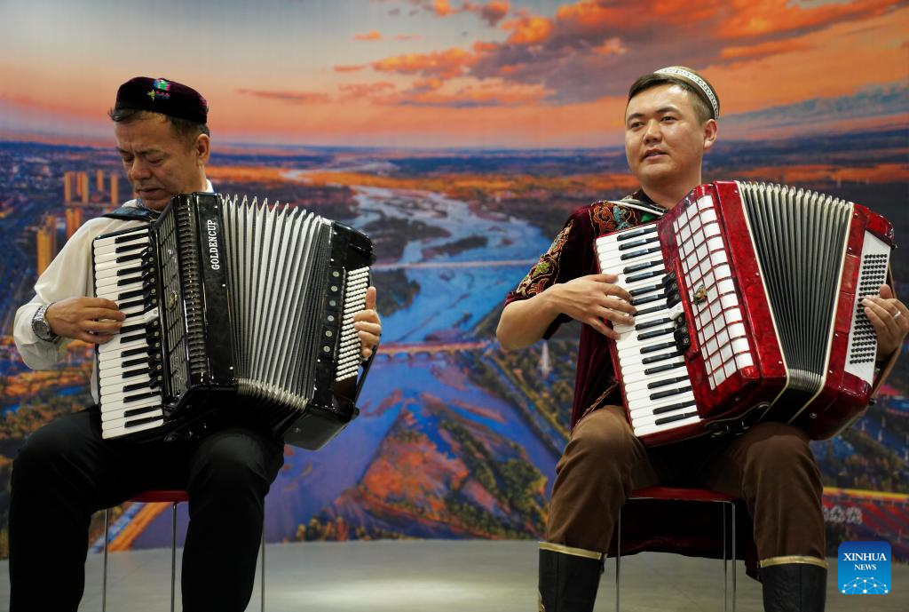 Musicians play accordions for tourists at the Alexander accordion collection hall on the Liuxing Street in Yining City, Ili Kazak Autonomous Prefecture, northwest China's Xinjiang Uygur Autonomous Region, Sept. 27, 2024. (Xinhua/Zhao Yusi)