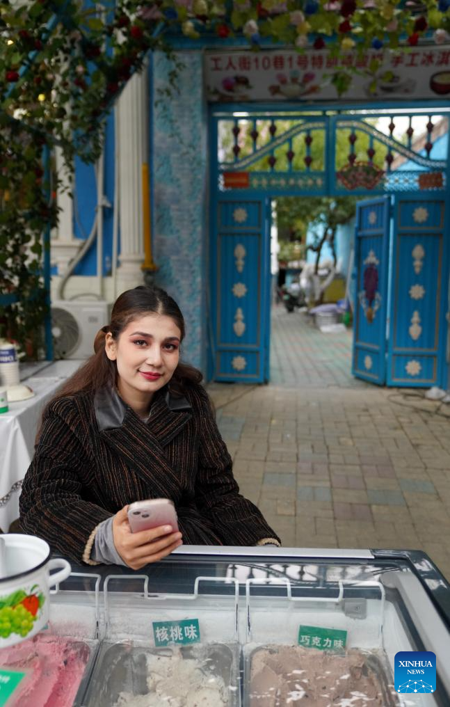 An ice cream vendor waits for customers on the Liuxing Street in Yining City, Ili Kazak Autonomous Prefecture, northwest China's Xinjiang Uygur Autonomous Region. Sept. 27, 2024. (Xinhua/Zhao Yusi)
