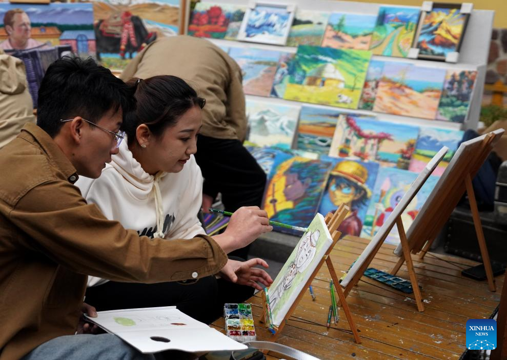 Tourists draw oil paintings on the Liuxing Street in Yining City, Ili Kazak Autonomous Prefecture, northwest China's Xinjiang Uygur Autonomous Region, Sept. 27, 2024. (Xinhua/Zhao Yusi)