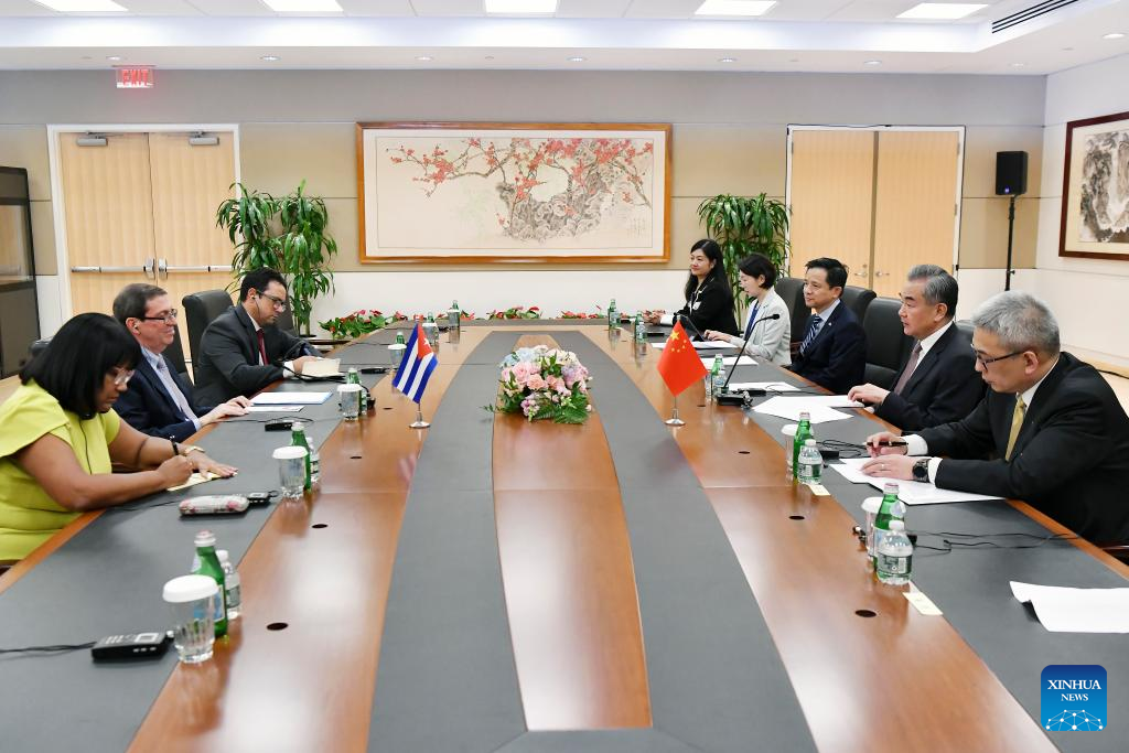 Chinese Foreign Minister Wang Yi, also a member of the Political Bureau of the Communist Party of China Central Committee, meets with Cuban Minister of Foreign Affairs Bruno Rodriguez Parrilla on the sidelines of the UN General Assembly session in New York, Sept. 27, 2024. (Xinhua/Li Rui)