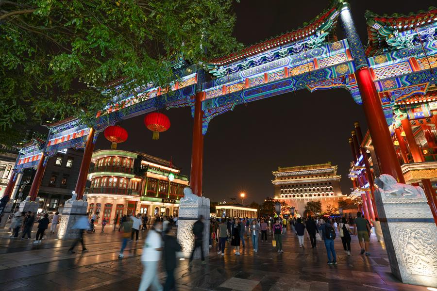 Tourists visit the Qianmen Street and the Zhengyang Gate arrow tower in Beijing, capital of China, Sept. 26, 2024. (Xinhua/Ju Huanzong)