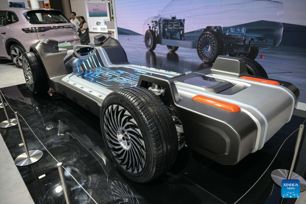 This photo taken on Sept. 28, 2024 shows a chassis with AI technology at the booth of Geely during an exhibition featuring cutting-edge technologies and products of new energy vehicle (NEV) in Haikou, south China's Hainan Province, Sept. 28, 2024. More than 30 NEV firms showcased their new energy vehicles, batteries and intelligent-connected technology at the exhibition. (Xinhua/Pu Xiaoxu)