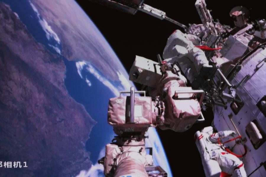 This screen image captured at Beijing Aerospace Control Center on July 3, 2024 shows Shenzhou-18 astronauts Li Cong (above) and Ye Guangfu performing extravehicular activities. (Xinhua/Guo Zhongzheng)