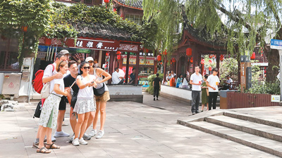 Foreign tourists pose for a picture at Qibao, an ancient town in Shanghai. (Xinhua/Fang Zhe)