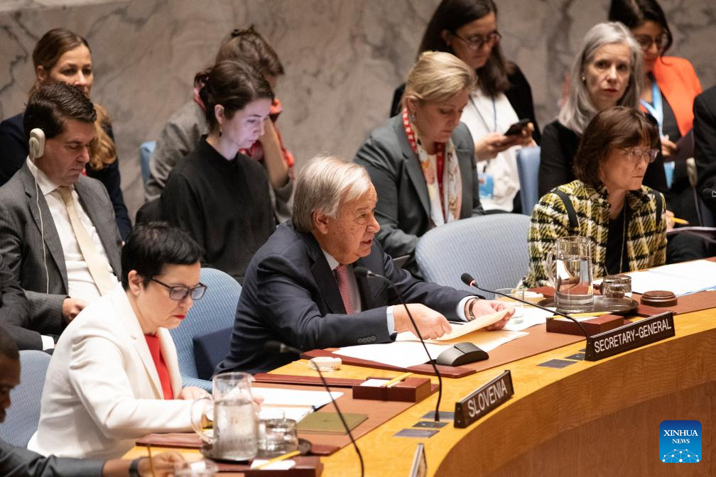 UN Secretary-General Antonio Guterres (C) speaks during a Security Council emergency session on the situation in the Middle East at the UN headquarters in New York, on Oct. 2, 2024. Guterres on Wednesday condemned Iran's missile attack against Israel on Tuesday. (Xinhua/Xie E)