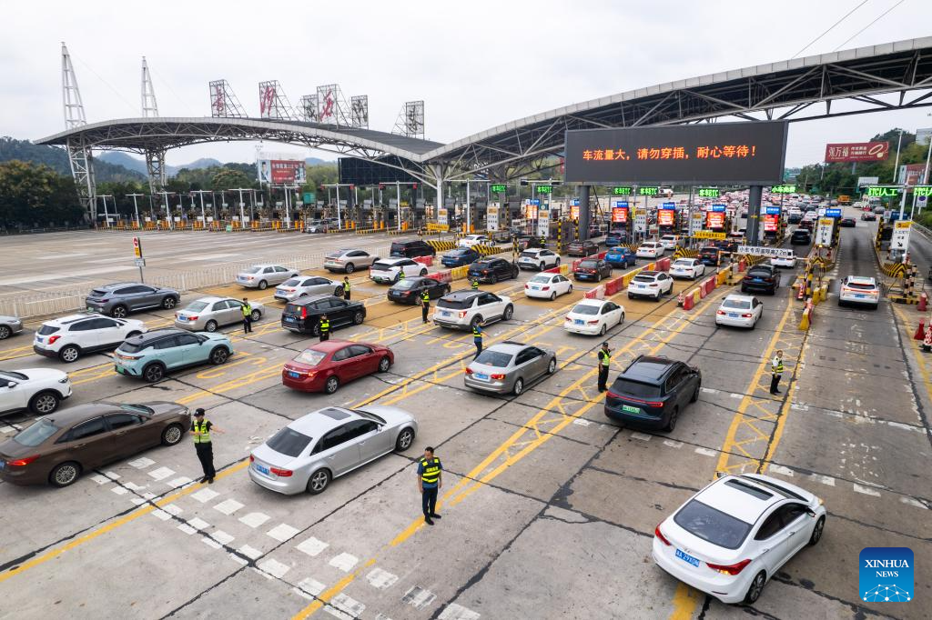 Vehicles are seen near a highway toll station in Changsha, central China's Hunan Province, Oct. 1, 2024. Tuesday marks the first day of China's National Day holiday. China is expected to see 175 million railway trips during the 10-day travel rush, which runs from Sept. 29 to Oct. 8, according to China State Railway Group Co., Ltd. (Xinhua/Chen Sihan)