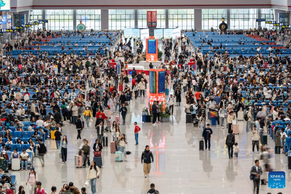 Passengers are seen at a waiting hall of Guiyang North Railway Station in Guiyang, southwest China's Guizhou Province, Oct. 1, 2024. Tuesday marks the first day of China's National Day holiday. China is expected to see 175 million railway trips during the 10-day travel rush, which runs from Sept. 29 to Oct. 8, according to China State Railway Group Co., Ltd. (Xinhua/Liu Xu)