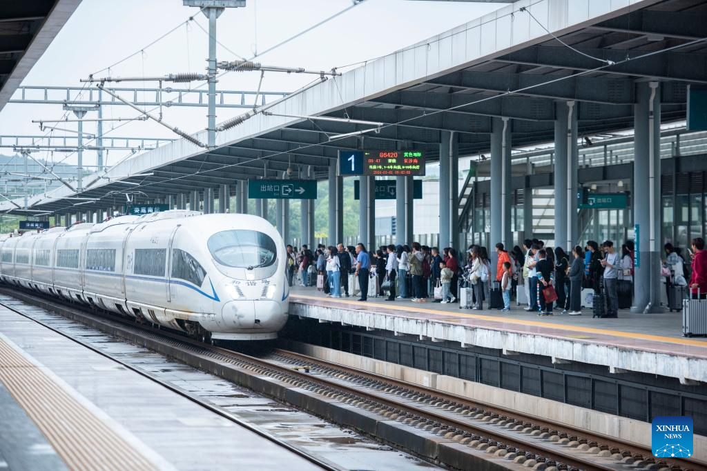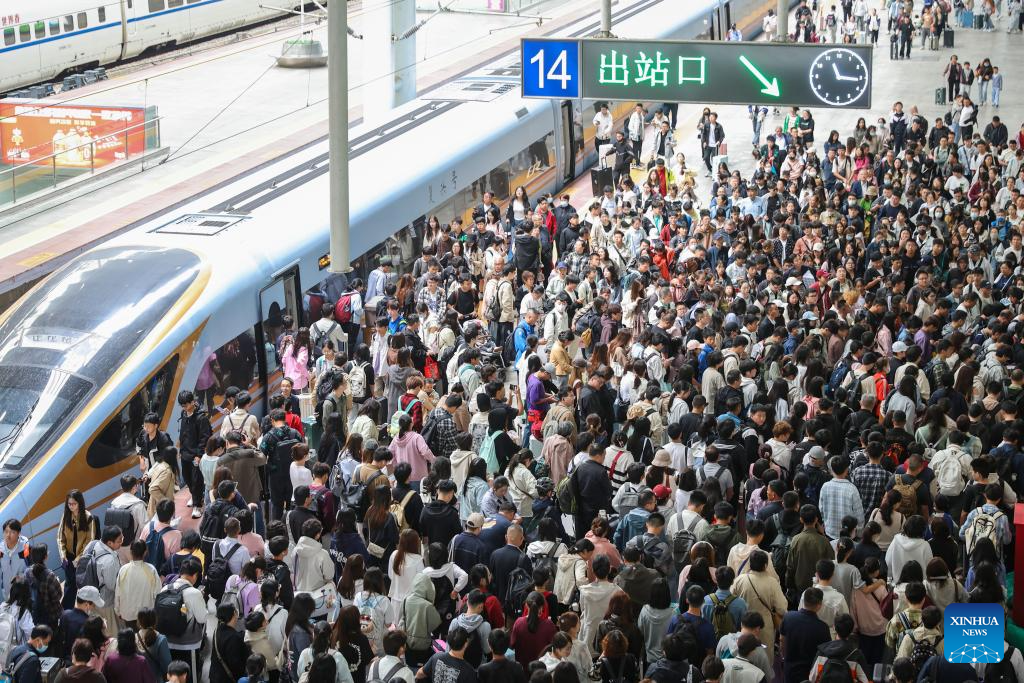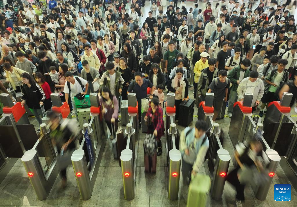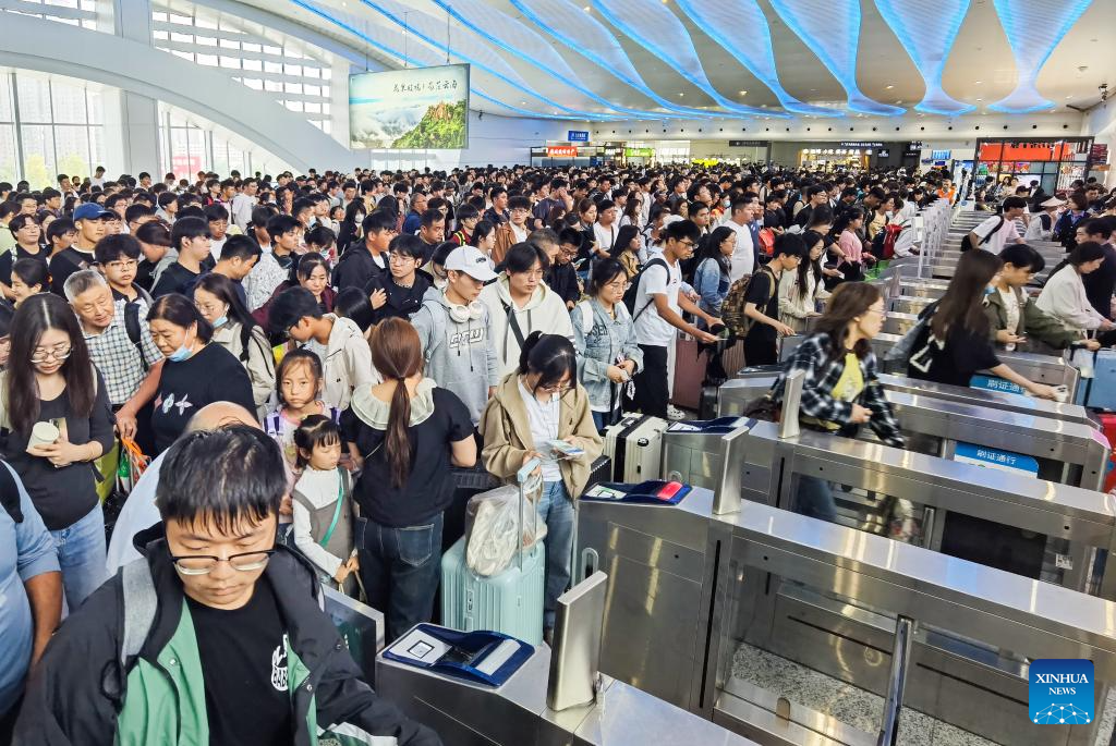 Passengers get off trains at Guiyang North Railway Station in Guiyang, southwest China's Guizhou Province, Oct. 1, 2024. Tuesday marks the first day of China's National Day holiday. China is expected to see 175 million railway trips during the 10-day travel rush, which runs from Sept. 29 to Oct. 8, according to China State Railway Group Co., Ltd. (Xinhua/Liu Xu)