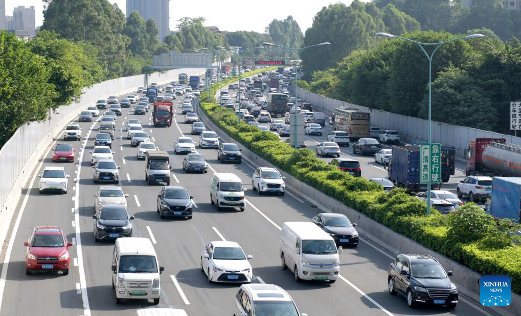 Vehicles move on a city expressway in Guangzhou, south China's Guangdong Province, Oct. 1, 2024. Tuesday marks the first day of China's National Day holiday. China is expected to see 175 million railway trips during the 10-day travel rush, which runs from Sept. 29 to Oct. 8, according to China State Railway Group Co., Ltd. (Xinhua/Lu Hanxin)