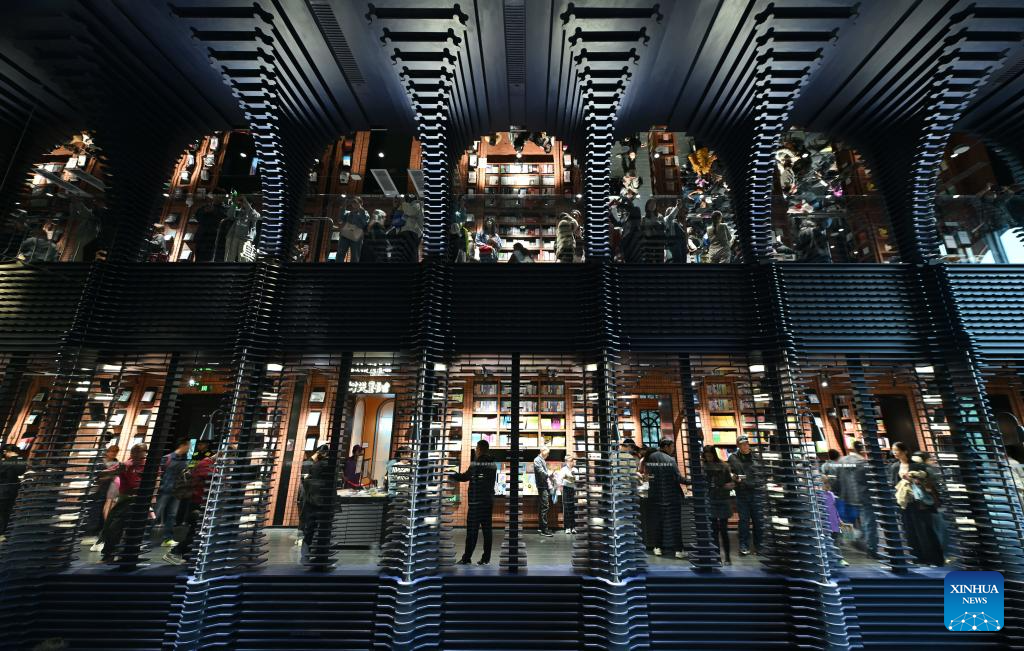 This photo taken on Oct. 2, 2024 shows a view of Zhongshuge Bookstore in the Italian Style Area in Tianjin, north China. Zhongshuge Bookstore, an urban renewal and upgrading project of Tianjin, attracts many tourists during the National Day holiday. It will serve citizens with various cultural activities to promote reading in the future. (Xinhua/Sun Fanyue)