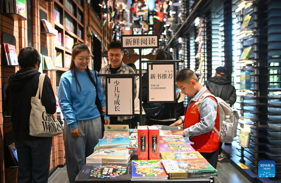 Readers select books at Zhongshuge Bookstore in the Italian Style Area in Tianjin, north China, Oct. 2, 2024. Zhongshuge Bookstore, an urban renewal and upgrading project of Tianjin, attracts many tourists during the National Day holiday. It will serve citizens with various cultural activities to promote reading in the future. (Xinhua/Sun Fanyue)