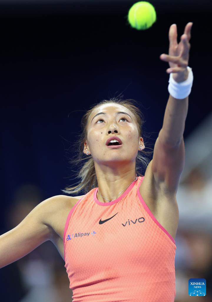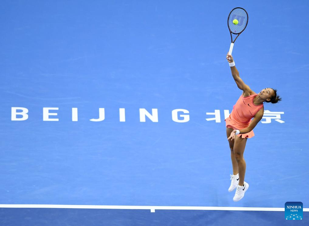 Zheng Qinwen of China serves during the women's singles 3rd round match against Nadia Podoroska of Argentina at 2024 China Open tennis tournament in Beijing, capital of China, Sept. 30, 2024. (Xinhua/Zhang Chenlin)