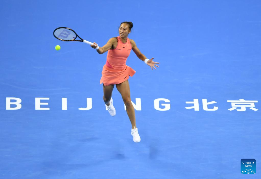 Zheng Qinwen of China hits a return during the women's singles 3rd round match against Nadia Podoroska of Argentina at 2024 China Open tennis tournament in Beijing, capital of China, Sept. 30, 2024. (Xinhua/Zhang Chenlin)
