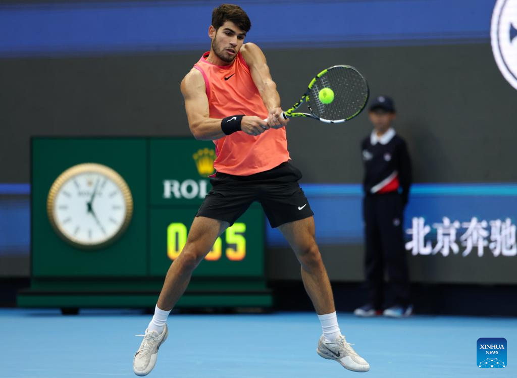 Carlos Alcaraz of Spain competes during the men's singles quarterfinals against Karen Khachanov of Russia at 2024 China Open tennis tournament in Beijing, capital of China, Sept. 30, 2024. (Xinhua/Zhang Chenlin)