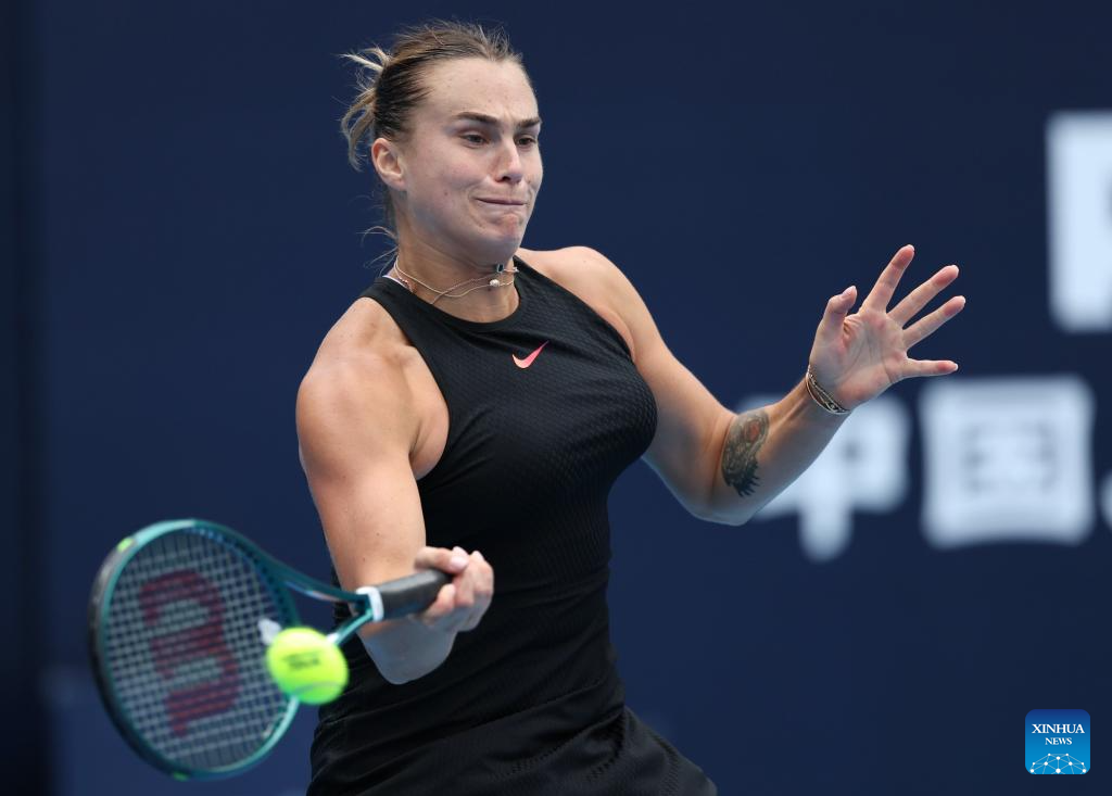 Aryna Sabalenka of Belarus hits a return during the women's singles third round match against Ashlyn Krueger of the United States at 2024 China Open tennis tournament in Beijing, capital of China, Sept. 30, 2024. (Xinhua/Zhang Chenlin)