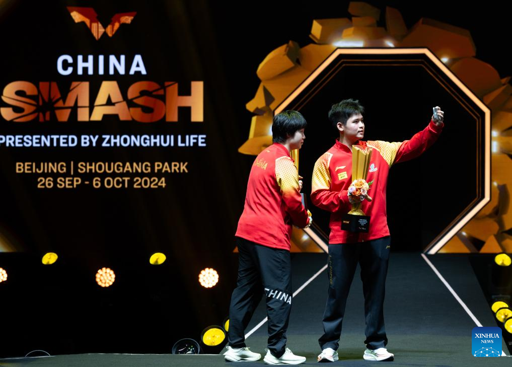 Lin Shidong (R)/Kuai Man take a selfie during the awarding ceremony after the mixed doubles final between Lin Shidong/Kuai Man of China and their teammates Lin Gaoyuan/Wang Yidi at 2024 World Table Tennis (WTT) China Smash in Beijing, China, Oct. 4, 2024. (Xinhua/Xiao Yijiu)