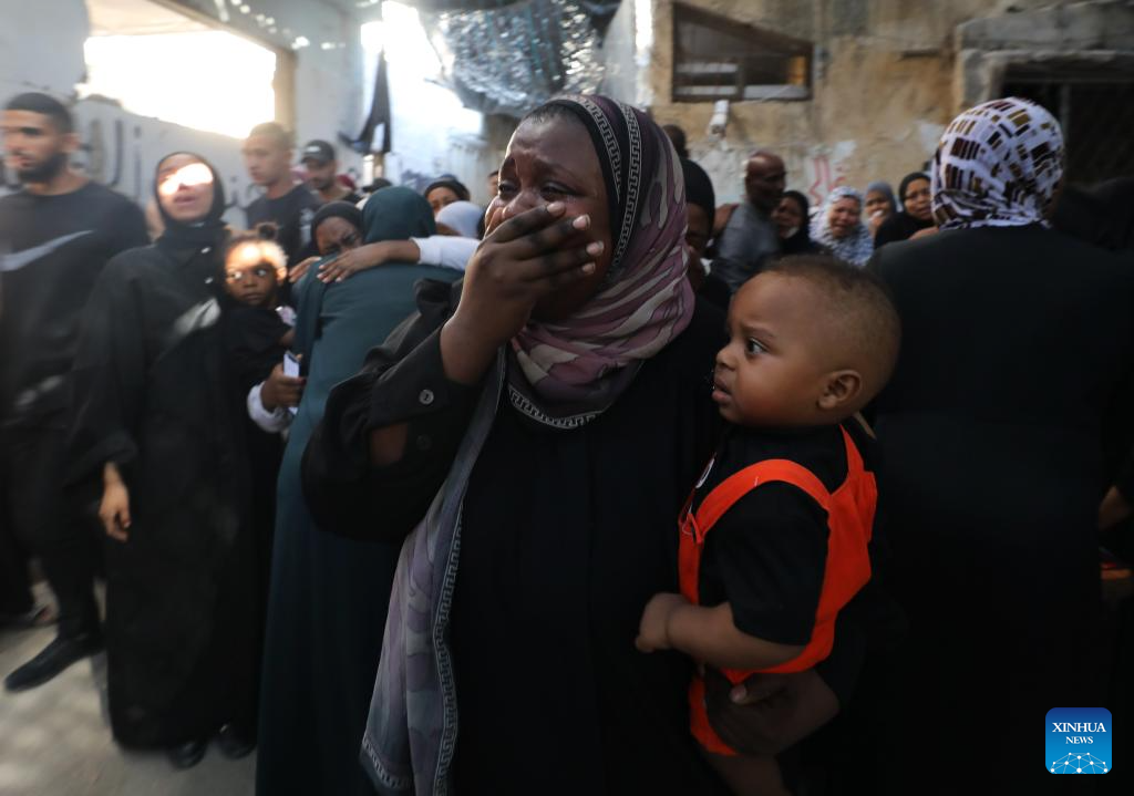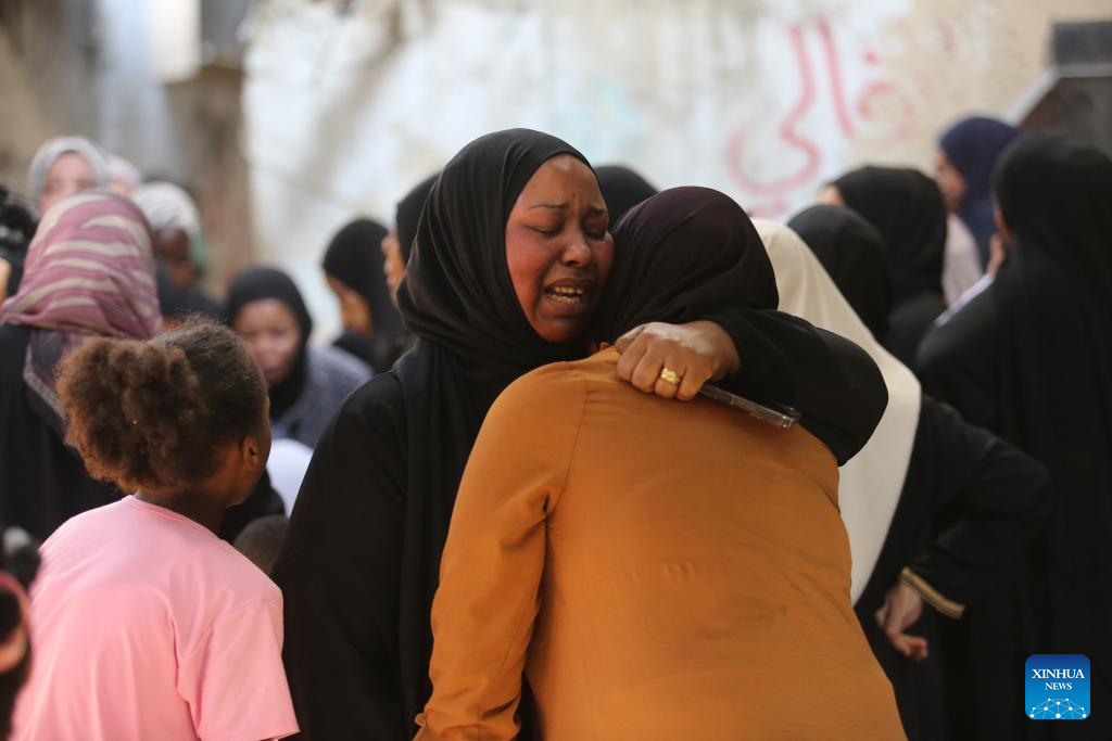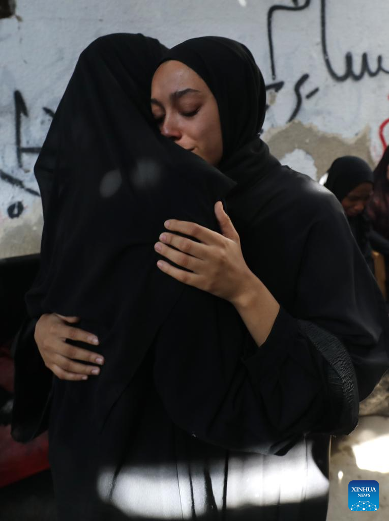 People comfort each other during a funeral for victims killed in an Israeli airstrike in the Tulkarm refugee camp, northern West Bank, on Oct. 4, 2024. At least 18 Palestinians were killed and many others wounded in an Israeli airstrike targeting the Tulkarm refugee camp in the northern West Bank on Thursday, the Palestinian Ministry of Health said in a brief statement. (Photo by Nidal Eshtayeh/Xinhua)
