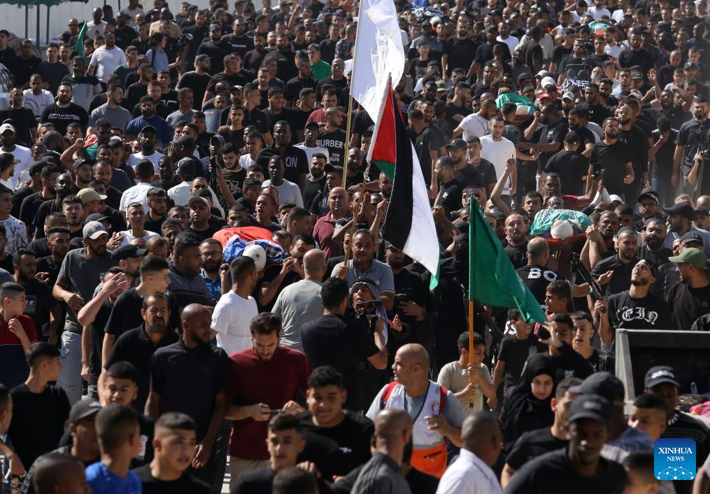People attend a funeral for victims killed in an Israeli airstrike in the Tulkarm refugee camp, northern West Bank, on Oct. 4, 2024. At least 18 Palestinians were killed and many others wounded in an Israeli airstrike targeting the Tulkarm refugee camp in the northern West Bank on Thursday, the Palestinian Ministry of Health said in a brief statement. (Photo by Nidal Eshtayeh/Xinhua)