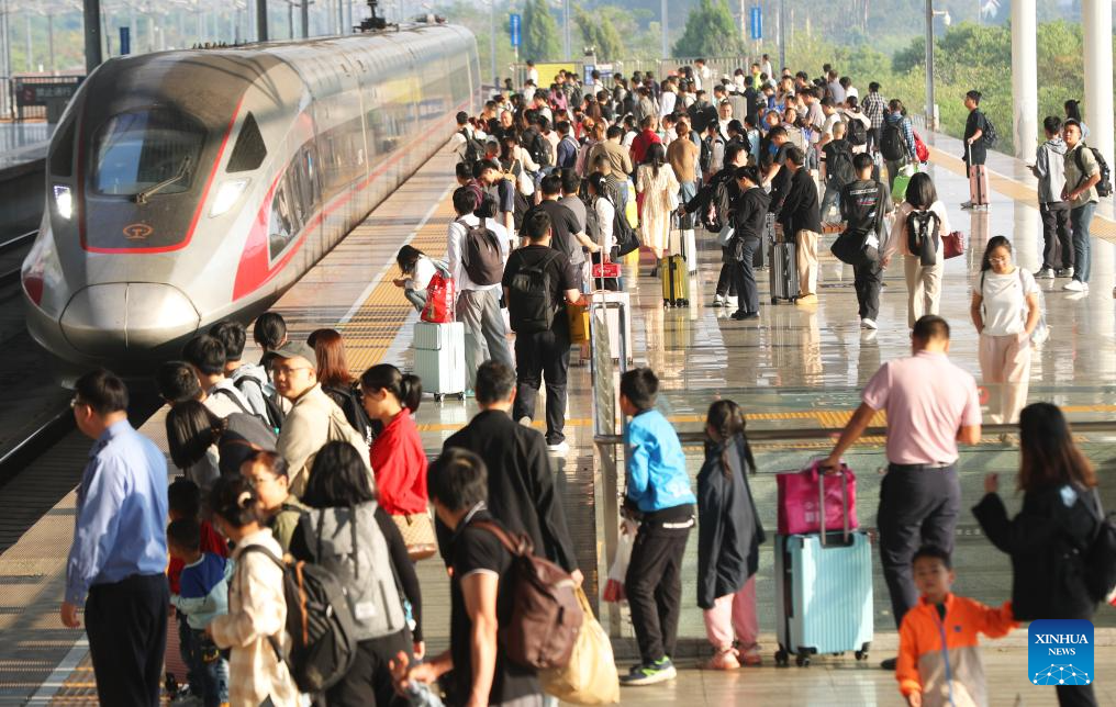 Passengers wait to board a train at the platform at Hengyang East Railway Station in Hengyang City, central China's Hunan Province, Oct. 6, 2024. China sees a surge in return trips on Sunday as the week-long National Day holiday draws to a close. (Photo by Cao Zhengping/Xinhua)