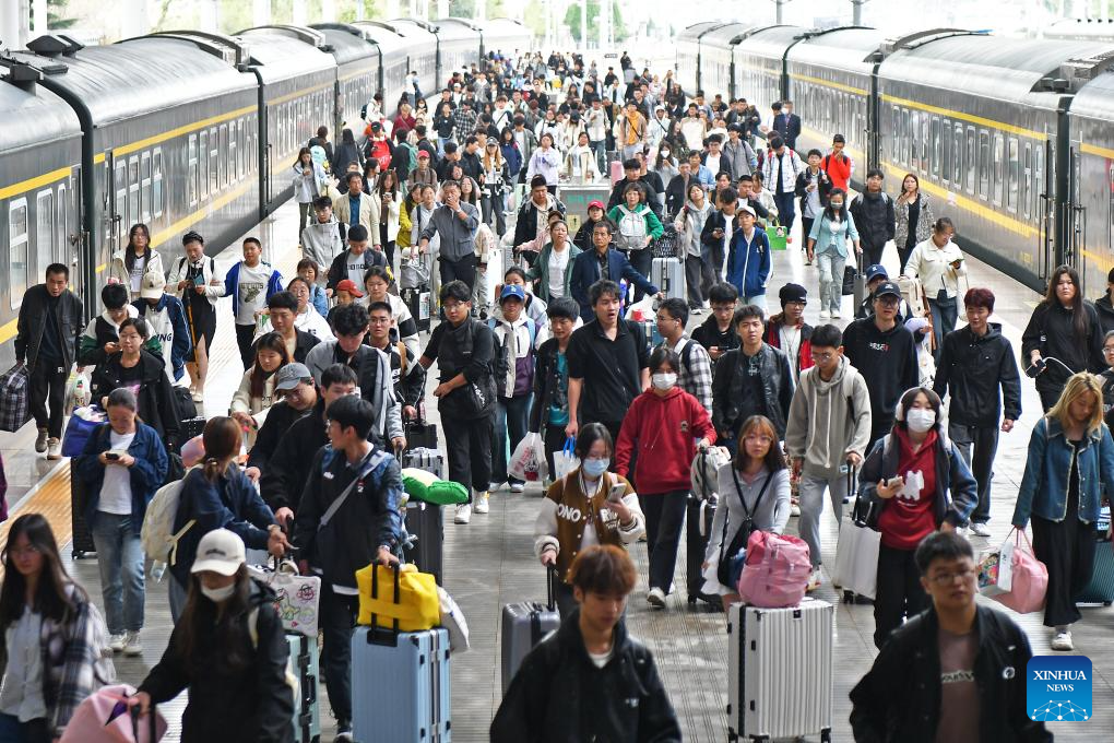 Passengers walk on the platform at Yantai Railway Station in Yantai, east China's Shandong Province, Oct. 6, 2024. China sees a surge in return trips on Sunday as the week-long National Day holiday draws to a close. (Photo by Sun Wentan/Xinhua)