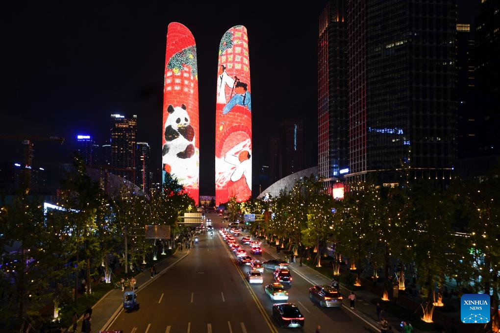 This photo shows a light show in Chengdu, capital of southwest China's Sichuan Province, Oct. 1, 2024. During the week-long National Day holiday starting on Oct. 1, Chinese people take a break to travel and enjoy leisure activities. Travel and holiday consumption have continued to boom, mirroring the vitality of Chinese economy. (Xinhua/Xu Bingjie)