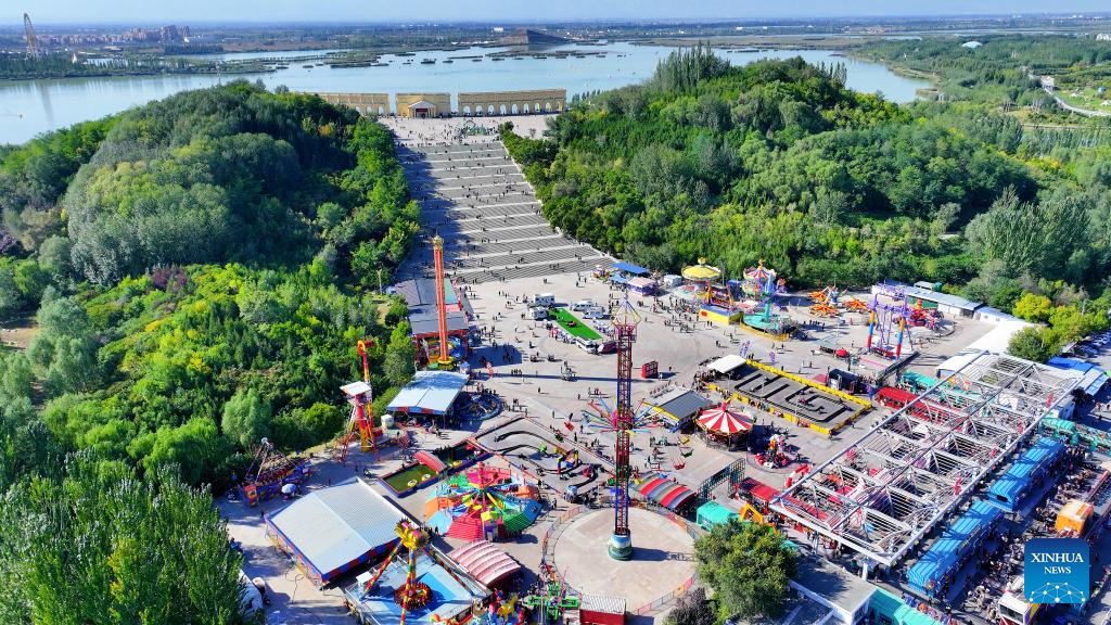 A drone photo shows people visiting Lanshan park in Yinchuan, northwest China's Ningxia Hui Autonomous Region, Oct. 2, 2024. During the week-long National Day holiday starting on Oct. 1, Chinese people take a break to travel and enjoy leisure activities. Travel and holiday consumption have continued to boom, mirroring the vitality of Chinese economy. (Xinhua/Wang Peng)