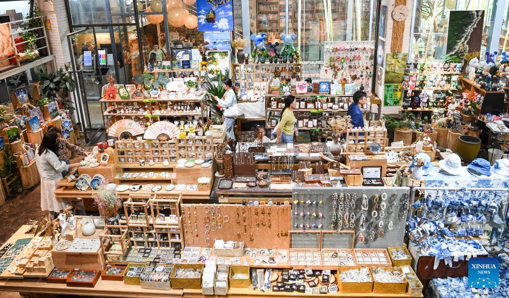 People select products at the Beicang Cultural and Creative Block in Jiangbei District of southwest China's Chongqing Municipality, Oct. 4, 2024. During the week-long National Day holiday starting on Oct. 1, Chinese people take a break to travel and enjoy leisure activities. Travel and holiday consumption have continued to boom, mirroring the vitality of Chinese economy. (Xinhua/Wang Quanchao)