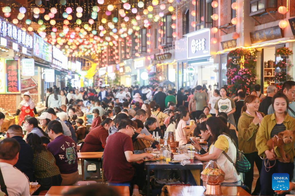People taste local food in Jianshui County of the Honghe Hani and Yi Autonomous Prefecture in southwest China's Yunnan Province, Oct. 4, 2024. During the week-long National Day holiday starting on Oct. 1, Chinese people take a break to travel and enjoy leisure activities. Travel and holiday consumption have continued to boom, mirroring the vitality of Chinese economy. (Photo by Yang Junpeng/Xinhua)