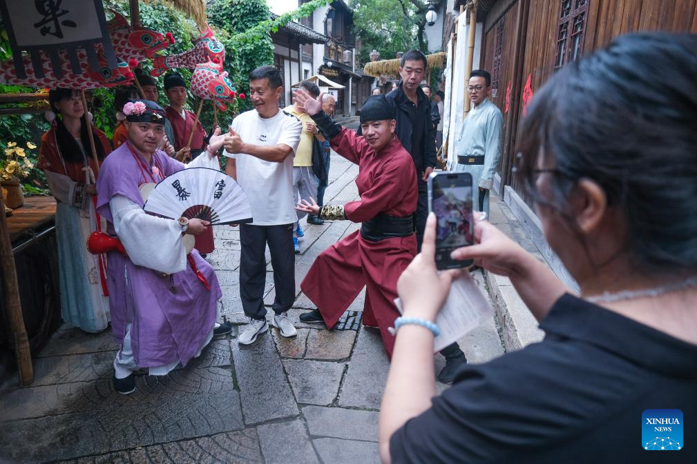 Staff members in traditional costumes interact with visitors at the Puyuan Fashion Resort in Puyuan Town of Tongxiang City, east China's Zhejiang Province, Oct. 5, 2024. During the week-long National Day holiday starting on Oct. 1, Chinese people take a break to travel and enjoy leisure activities. Travel and holiday consumption have continued to boom, mirroring the vitality of Chinese economy. (Xinhua/Xu Yu)