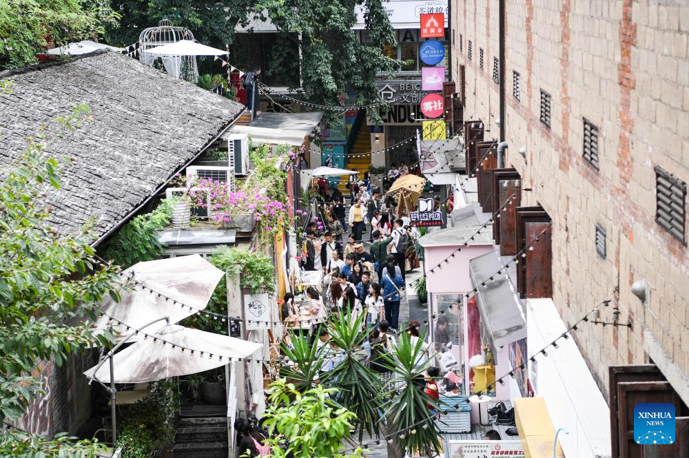 People visit the Beicang Cultural and Creative Block in Jiangbei District of southwest China's Chongqing Municipality, Oct. 4, 2024. During the week-long National Day holiday starting on Oct. 1, Chinese people take a break to travel and enjoy leisure activities. Travel and holiday consumption have continued to boom, mirroring the vitality of Chinese economy. (Xinhua/Wang Quanchao)