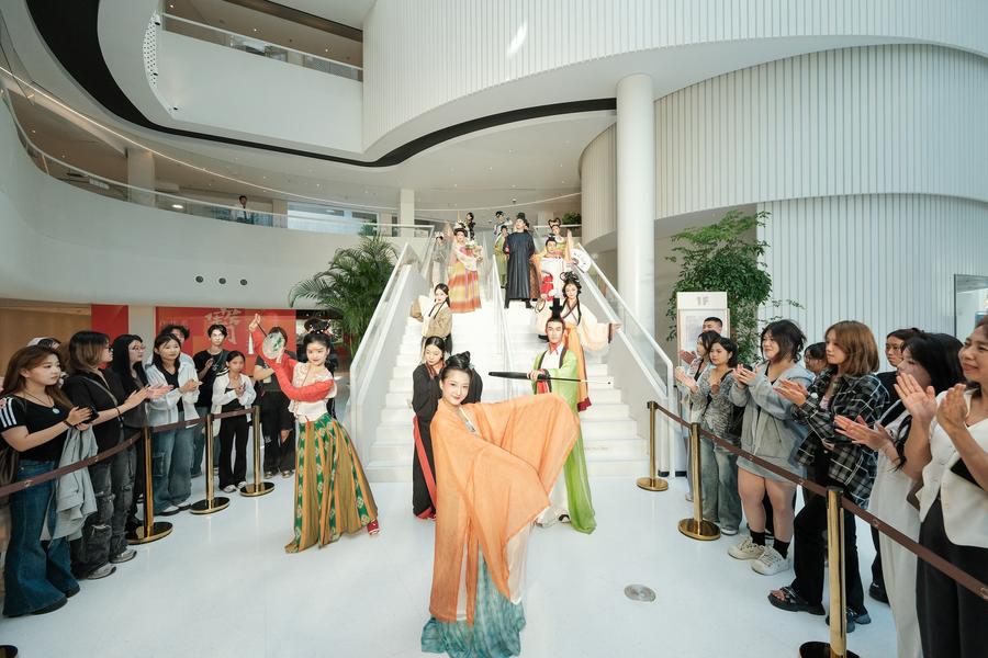 People watch a performance of traditional Chinese costumes at a center for popular culture in Baoshan of east China's Shanghai, Oct. 2, 2024. (Xinhua/Wang Xiang)