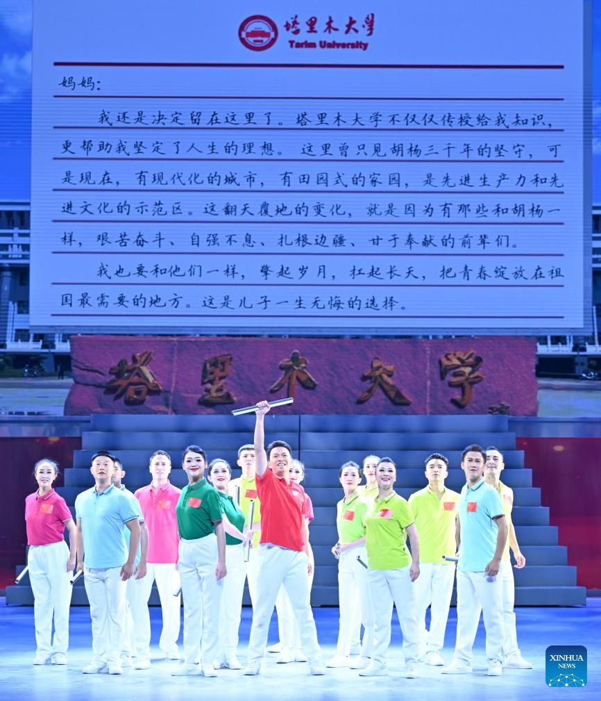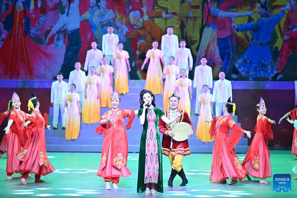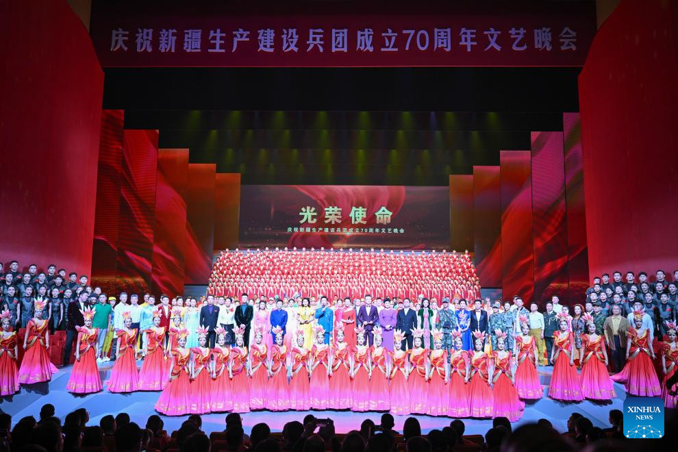 An artistic performance is staged to celebrate the 70th founding anniversary of the Xinjiang Production and Construction Corps in Urumqi, capital of northwest China's Xinjiang Uygur Autonomous Region, Oct. 6, 2024. (Xinhua/Li Xiang)