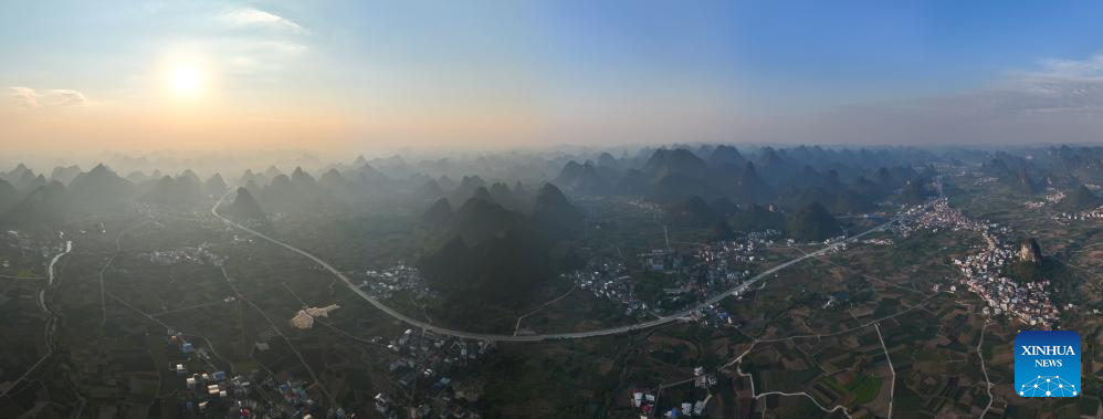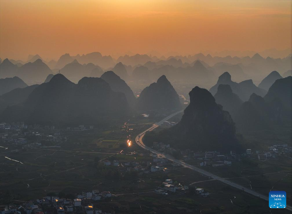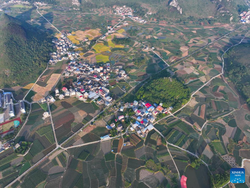 This aerial drone photo taken on Oct. 7, 2024 shows the autumn scenery of a village in Sandu Town of Liujiang District, Liuzhou City, south China's Guangxi Zhuang Autonomous Region. (Xinhua/Huang Xiaobang)