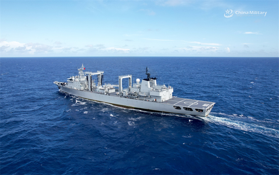 Type 903A Comprehensive supply ship Kekexilihu (Hull 903) attached to a combat support ship flotilla under the Chinese PLA Navy sails to the designated area during a recent multi-subject maritime training exercise aiming to enhance the troops' capabilities of replenishment, emergency response, and comprehensive offensive and defensive operations. (eng.chinamil.com.cn/Photo by Xu Taotao)