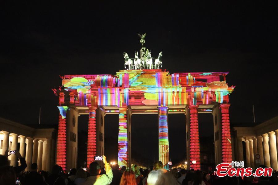 A landmark building is illuminated during the 2024 Festival of Lights in Berlin, Germany, Oct. 8, 2024. (Photo: China News Service/Ma Xiuxiu)